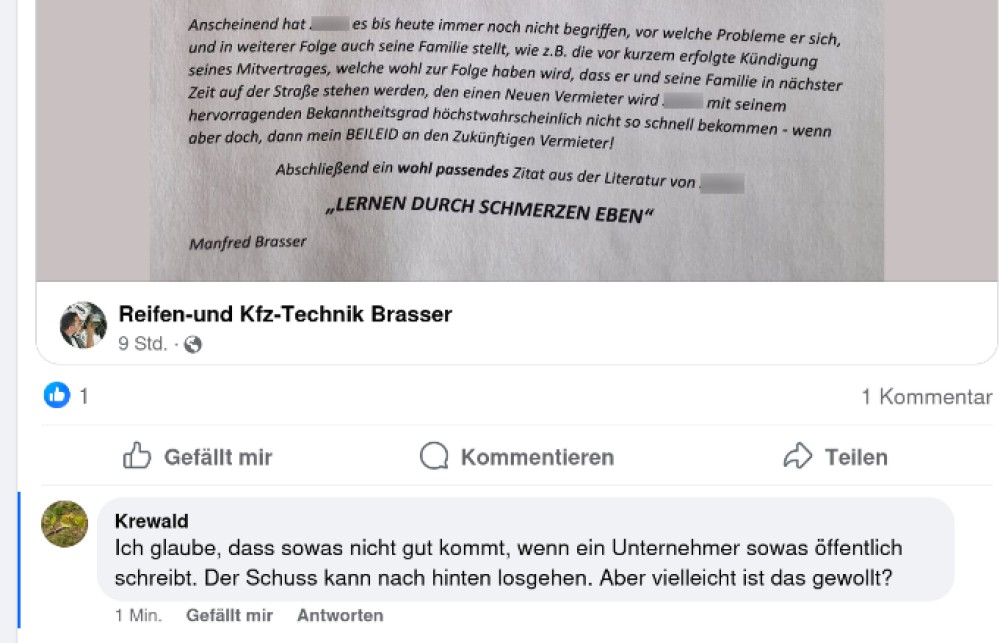 Der Frauentaler Reifenhändler, ein ehemaliger Straßenbau-Hilfsarbeiter, der lt. Zeugen am Straßenbau nicht mit Rechen & Schaufel umgehen konnte, der mir Ersatzteile berechnet aber nicht eingebaut, der die Karosserie meines Autos zerstört, der mich anschließend verhetzt & verleumdet hat, wusste von der Hausübernahme, obwohl es devinitiv kein Außenstehender wissen konnte. Das beweist, dass diese drei befreundeten Firmeninhaber untereinander persönliche Kunden- und Mitarbeiterdaten austauschen, gemeinsam hetzen, sich dummerweise aber auch gegenseitig verraten. Der Reifenhändler postete das hier aus Rache auf seiner geschäftlichen Facebook-Seite, weil seine unseriösen Machenschaften aufgedeckt wurden. Für diesen Beitrag bekam er eine Geldstrafe mit einem Jahr Probezeit. Leider viel zu wenig, aber immerhin …
